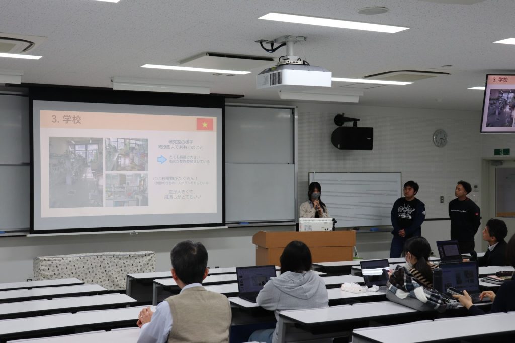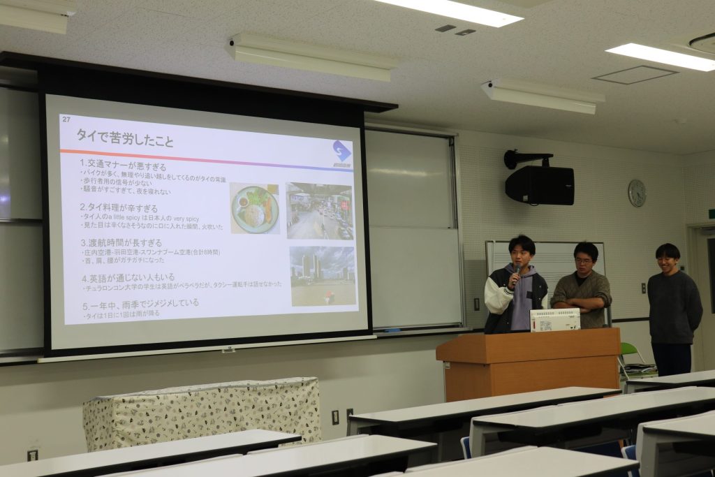10月31日(金)、夏季海外派遣プログラム活動報告会を実施しました。夏季休業中に海外大学での研究活動や海外企業でのインターンシップに挑戦した本校学生18名が、自身の活動について報告しました。今年度は、派遣先の新規開拓により、新たにマレーシアの大学でのサマースクールやベトナムの大学での研究派遣が実施されました。また初めての試みとして、ニュージーランド現地企業でのインターンシップ(就業体験)も始まり、3名の参加学生が体験談を報告ました。学生らは、各々の研究やインターン活動をもとに得られたものや今後の課題など、様々な気づきを共有しました。また、現地で出会った人々の温かさや、その人々との交流の思い出について語る学生も多く、日本ではできない貴重な経験ができたようです。この経験を基に、今後さらなるチャレンジをしてほしいと願います。